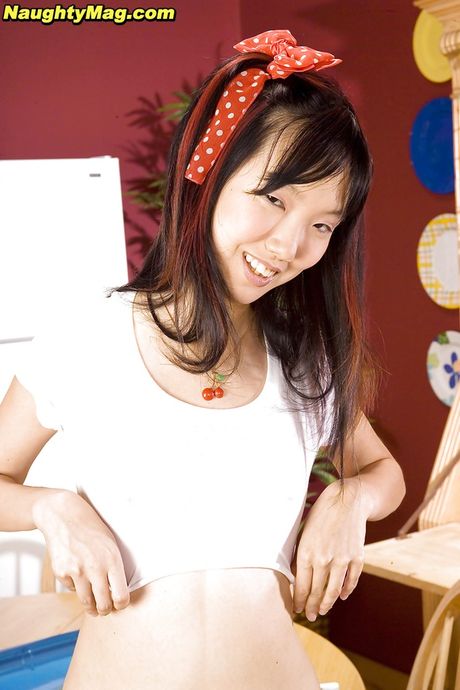 Naughty Mag: Excellent asian teen Lystra in sexy panties reveals tiny tits and puts a toy in her pussy in kitchen