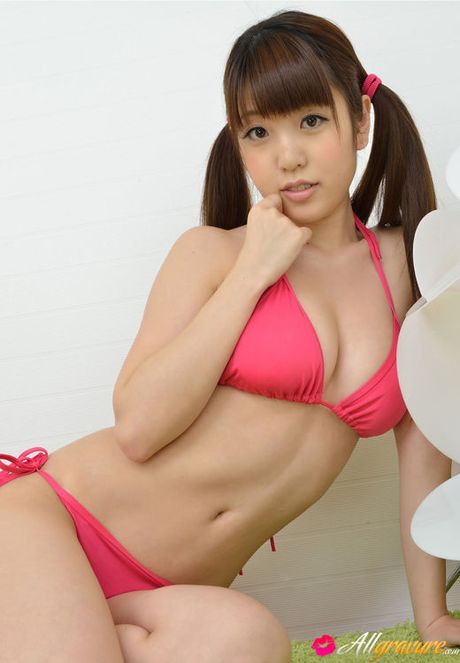 All Gravure: Mizuho Shiraishi with cans in pink bath suit plays with her hair